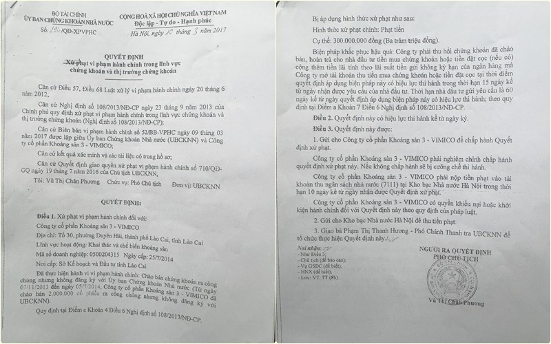 Theo đó, Vimico bị phạt 300 triệu đồng. Biện pháp khắc phục hậu quả: Vimico phải thu hồi chứng khoán đã chào bán, hoàn trả cho nhà đầu tư tiền mua chứng khoán hoặc tiền đặt cọc (nếu có) cộng thêm tiền lãi tính theo lãi suất tiền gửi không kỳ hạn của ngân hàng mà công ty mở tài khoản thu tiền mua chứng khoán hoặc tiền đặt cọc tại thời điểm quyết định áp dụng biện pháp này…