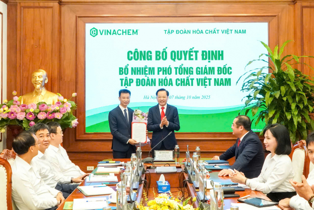 Lễ công bố Quyết định bổ nhiệm Phó Tổng Giám đốc Vinachem, Lãnh đạo Tập đoàn chúc mừng và chụp ảnh lưu niệm cùng tân Phó Tổng Giám đốc Nguyễn Văn Luyện