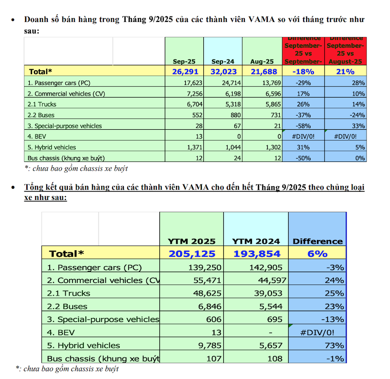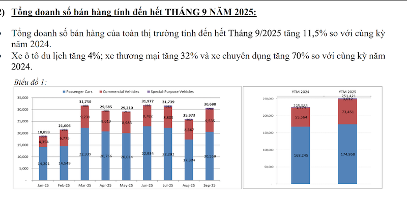 Cũng theo công bố của VAMA, tổng doanh số bán hàng 9 tháng năm 2025 của các thành viên VAMA đạt 205.125 xe. Còn tổng doanh số bán hàng của toàn thị trường trong 9 tháng năm 2025 theo cách tính của VAMA là 251.421 xe, tăng 11,5% so với cùng kỳ năm 2024. Trong đó, xe ô tô du lịch tăng 4%; xe thương mại tăng 32% và xe chuyên dụng tăng 70% so với cùng kỳ năm 2024.