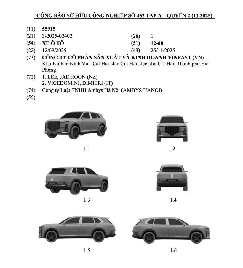 Cụ thể, Công báo sở hữu kiểu dáng công nghiệp số 452, tập A - quyển 2, tháng 11/2025 ghi nhận hai đăng ký kiểu dáng ô tô do VinFast đứng tên. Hình ảnh đính kèm cho thấy đây là một mẫu SUV cỡ lớn và một mẫu sedan fastback với thiết kế hoàn toàn mới, khác biệt rõ rệt so với dải sản phẩm VinFast đang bán trên thị trường.