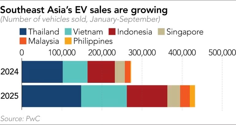 Tại Malaysia, dù đã trở thành thị trường ô tô lớn nhất ASEAN trong quý II, xe điện chỉ chiếm 4,5% tổng số xe đăng ký mới tính đến tháng 10. Tuy nhiên, con số này vẫn thể hiện mức tăng 44% so với cùng kỳ năm ngoái. Trong khi đó, tại Indonesia, tình hình kinh tế khó khăn đã ảnh hưởng đến doanh số ô tô, nhưng thị trường xe máy điện lại đang bùng nổ.