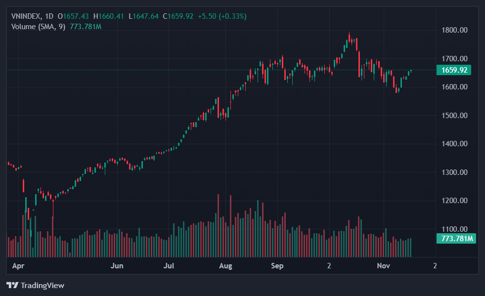 VN-Index tăng 3 phiên liên tiếp nhưng chưa thật sự bứt phá. Ảnh: TradingView.