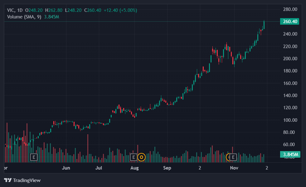 Cổ phiếu VIC đã tăng 10 phiên liên tiếp. Ảnh: TradingView.