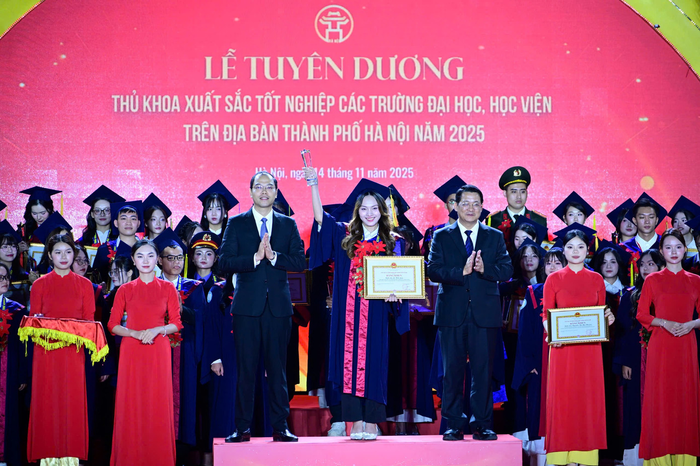 Đại diện cho 95 thủ khoa được vinh danh, bạn Nguyễn Thị Thúy Hường - thủ khoa xuất sắc tốt nghiệp trường Đại học Công nghệ, Đại học Quốc gia Hà Nội năm 2025 chia sẻ, trong bối cảnh Hà Nội và cả nước đang vươn mình mạnh mẽ trong công cuộc chuyển đổi số, phát triển kinh tế tri thức và hội nhập quốc tế sâu rộng, sinh viên hôm nay - những trí thức trẻ của tương lai càng phải chủ động tiếp thu tinh hoa nhân loại, không ngừng sáng tạo, dám nghĩ, dám làm, dám dấn thân, dám cống hiến.