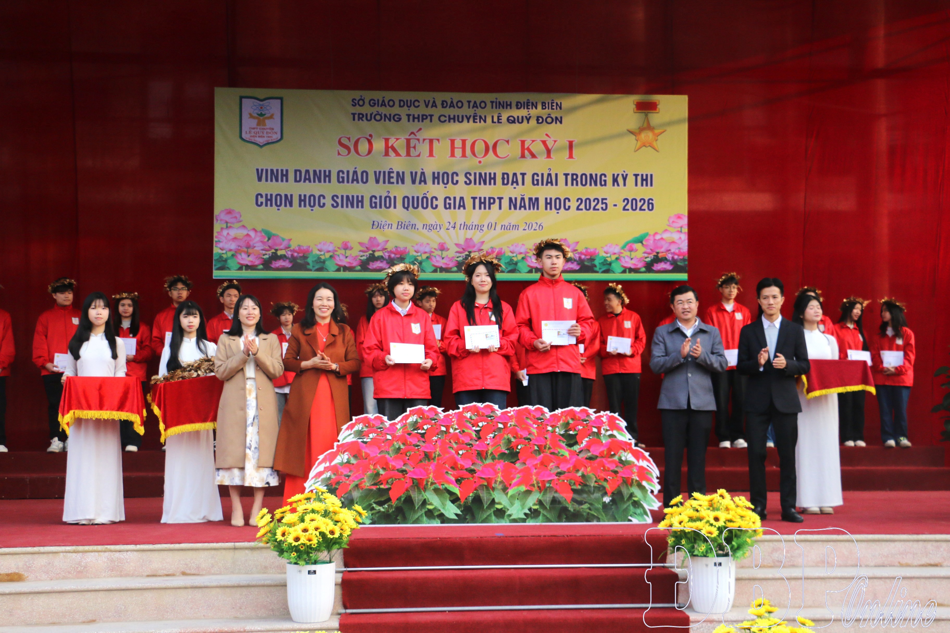 Nhân dịp này, Trường THPT Chuyên Lê Quý Đôn phối hợp với Ban đại diện cha mẹ học sinh, Chi nhánh Viettel Điện Biên và Quỹ học bổng “Đi thật xa để trở về” trao thưởng cho 25 học sinh đạt giải cùng các thầy, cô giáo có học sinh đạt thành tích cao tại Kỳ thi chọn học sinh giỏi quốc gia THPT năm học 2025–2026.