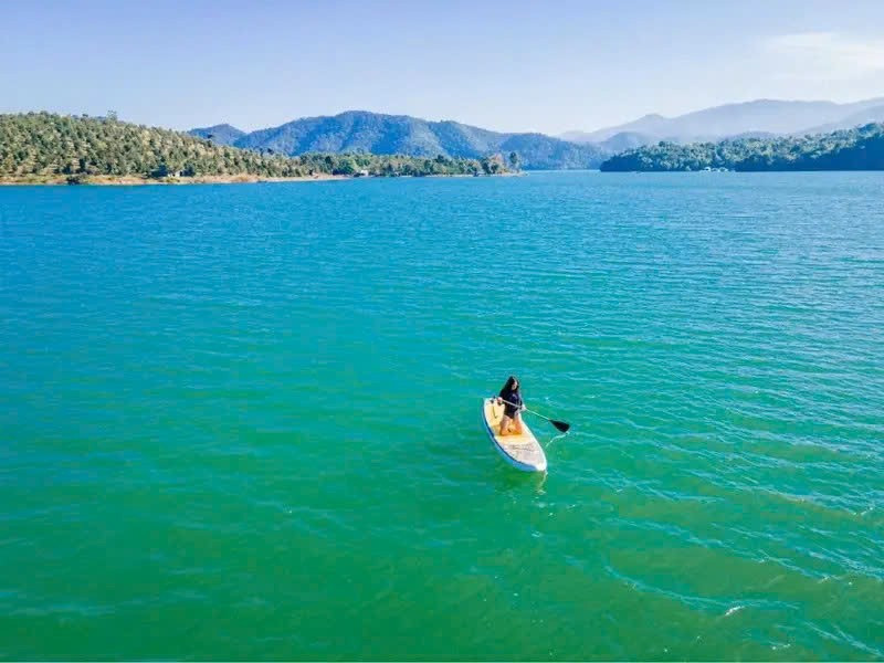 Không chỉ sở hữu cảnh quan thơ mộng, hồ Hàm Thuận còn là điểm dừng chân lý tưởng cho những ai yêu thích du lịch trải nghiệm. Du khách có thể chèo thuyền kayak trên mặt nước phẳng lặng, thả hồn theo những con sóng nhỏ lăn tăn giữa không gian tĩnh lặng. Ảnh sgtiepthi