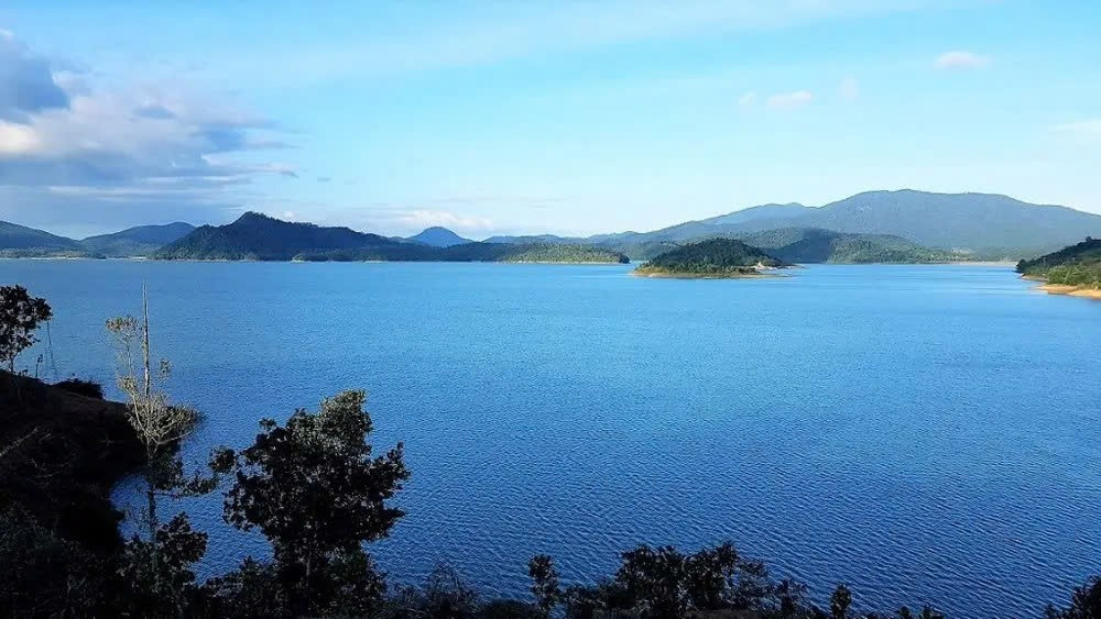 Từ trên cao nhìn xuống, hồ Hàm Thuận tựa như một dải lụa xanh mềm mại uốn quanh những triền đồi thấp, xen lẫn là tám hòn đảo nhỏ rải rác giữa lòng hồ. Bao quanh là những cánh rừng thông và rừng nguyên sinh xanh thẳm, nơi tiếng chim ríu rít hòa cùng tiếng gió vi vu qua tán lá. Ảnh dulichviet