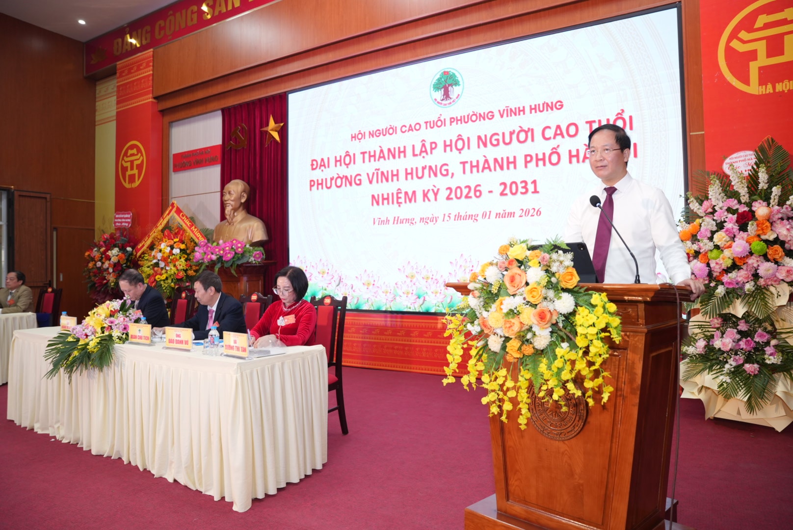 Lãnh đạo phường Vĩnh Hưng tặng hoa chúc mừng Đại hội. Ảnh: PV