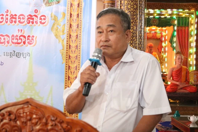 Thay mặt lãnh đạo địa phương, ông Trần Hải Dũ, Phó Bí thư Thường trực Đảng ủy xã Đôn Châu phát biểu chúc mừng Đại đức Thạch Ngọc vừa được Ban Trị sự GHPGVN tỉnh, Hội Đoàn kết Sư sãi yêu nước tỉnh trao quyết định giữ chức vụ trụ trì chùa Bà Giam.