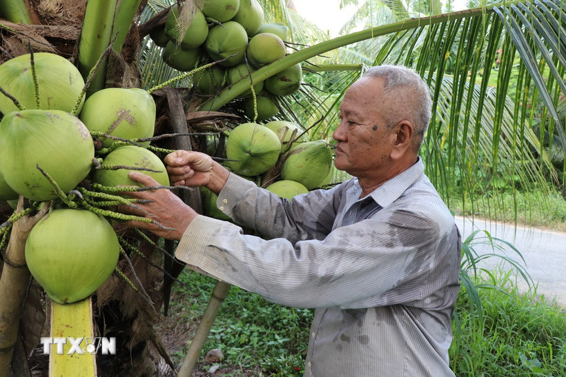 Ông Kim Văn Thành tại xã Song Lộc (Vĩnh Long) chuyển đổi 1,2ha đất trồng lúa sang trồng dừa 15 năm nay cho thu nhập tăng trên 10 lần so với trồng lúa. (Ảnh: Thanh Hòa/TTXVN)