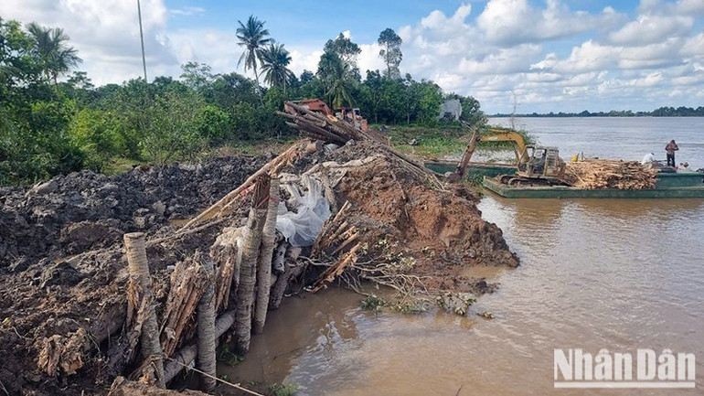 Đoạn sạt lở tại cồn Thanh Long cơ bản được gia cố.