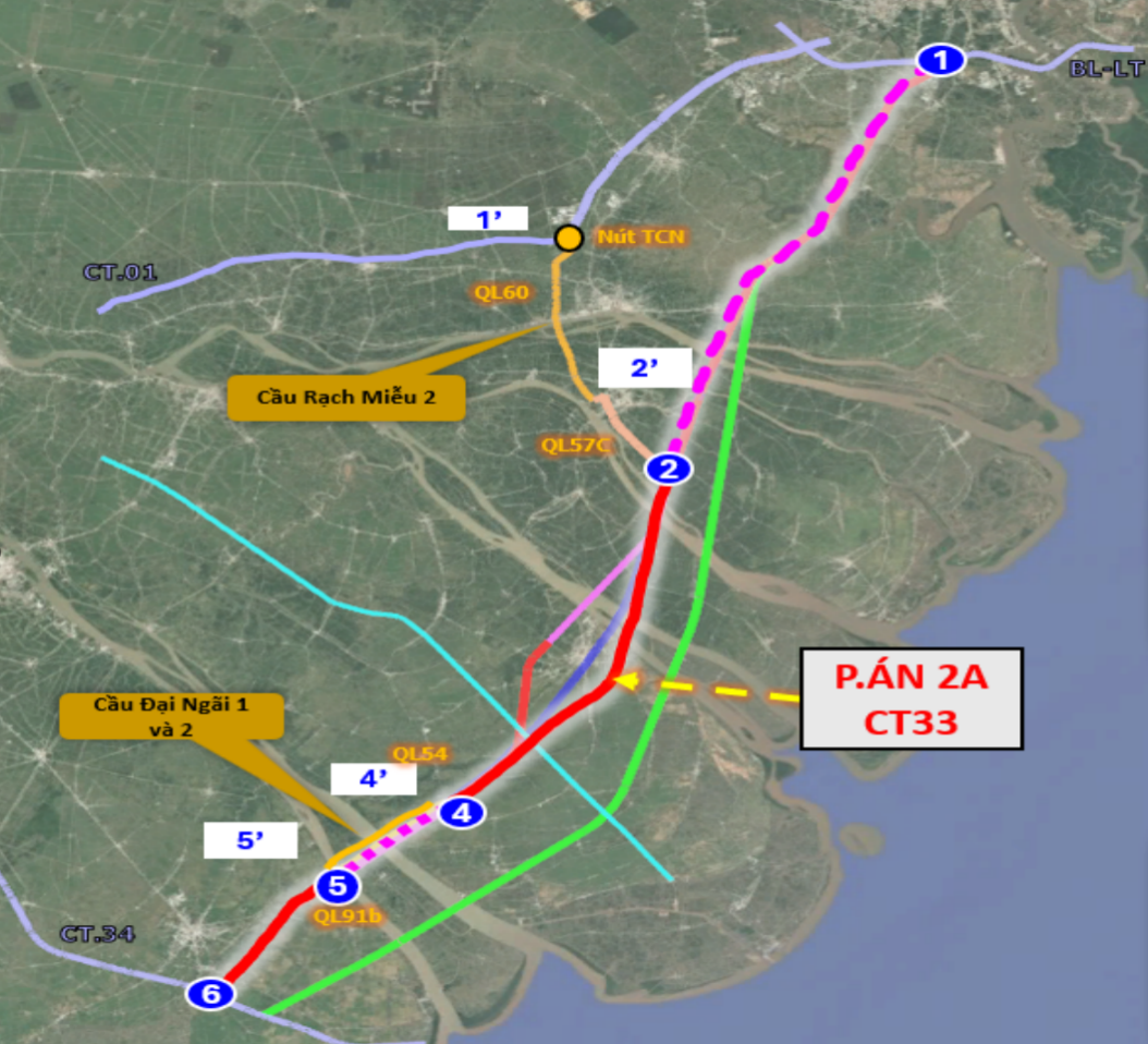 Trong đó, phương án thứ nhất đi theo hành lang Quốc lộ 60, Quốc lộ 57C, kết nối các công trình như cầu Rạch Miễu 2, cầu Đại Ngãi và tận dụng hạ tầng hiện hữu. Phương án còn lại điều chỉnh kết nối qua các cầu Hàm Luông, Cổ Chiên và Đại Ngãi.