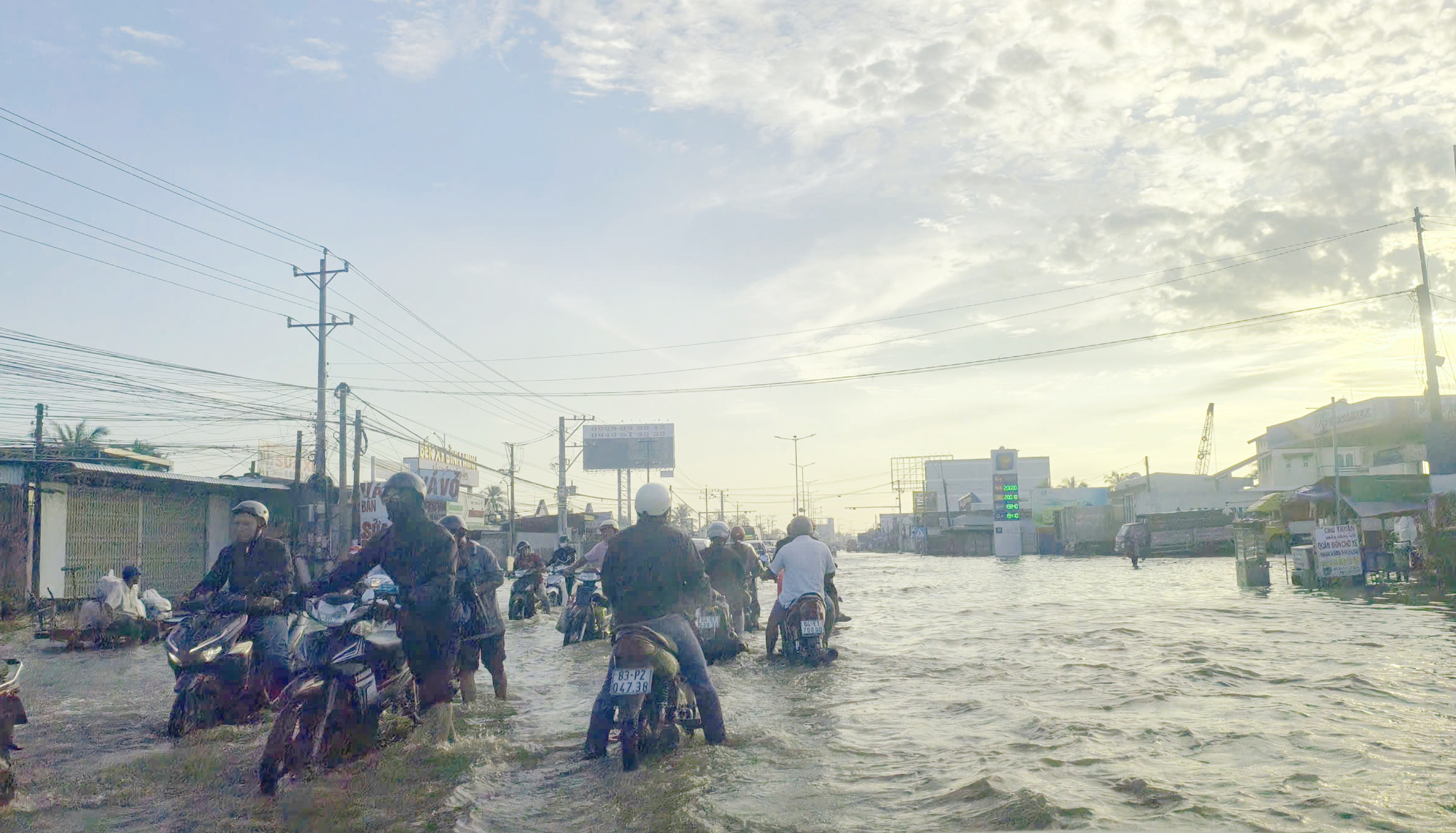 Đoạn qua Bến xe Bình Minh trên tuyến Quốc lộ 1 bị ngập do triều cường