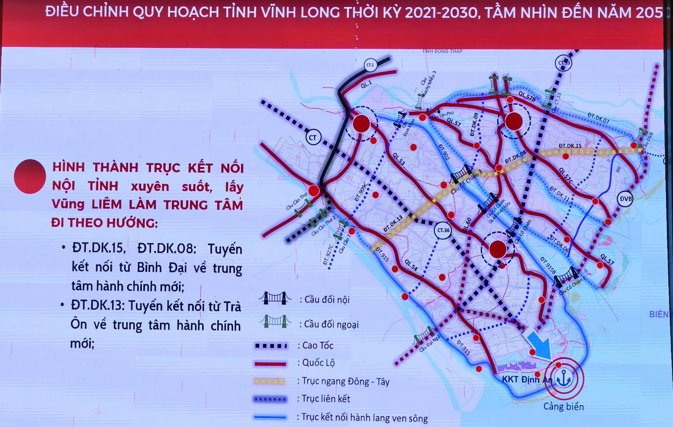 Bên cạnh đó, hành lang kinh tế Đông – Tây (Quốc lộ 60, cầu Rạch Miễu 2, cầu Đại Ngãi) giữ vai trò then chốt trong liên kết liên vùng, mở rộng không gian phát triển ra hướng biển; thúc đẩy xuất khẩu, logistics và phát triển đô thị, du lịch sinh thái ven sông, ven biển. Các hành lang nội tỉnh dọc Quốc lộ 53, 54, 57 tiếp tục được định hướng phát triển nhằm tăng cường kết nối trung tâm tỉnh với các vùng sản xuất nông nghiệp và đô thị vệ tinh.