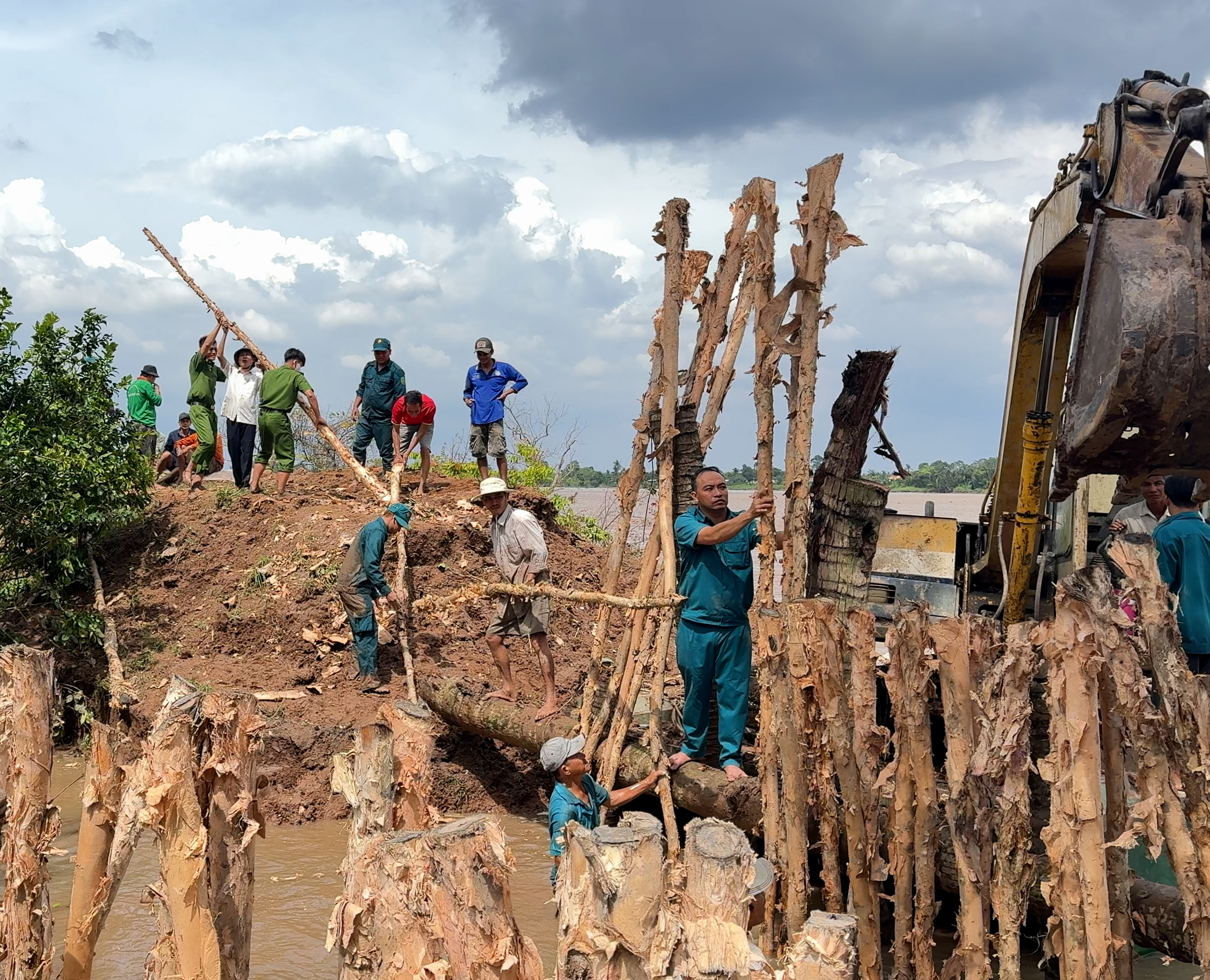 Lực lượng chức năng cùng người dân dùng cừ tràm để gia cố lại đoạn đê bị vỡ. Ảnh: HL
