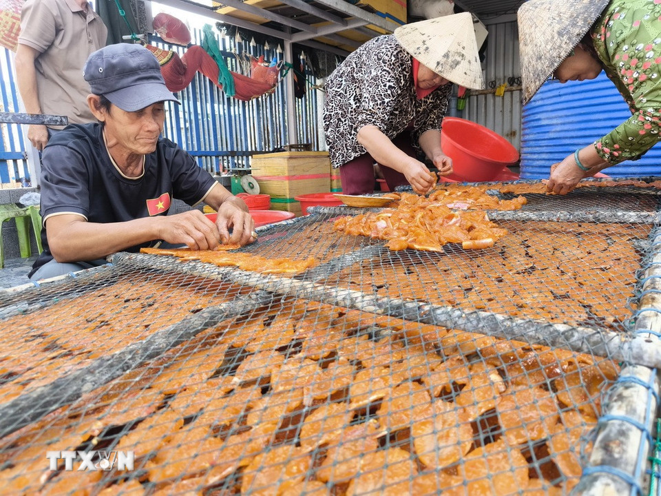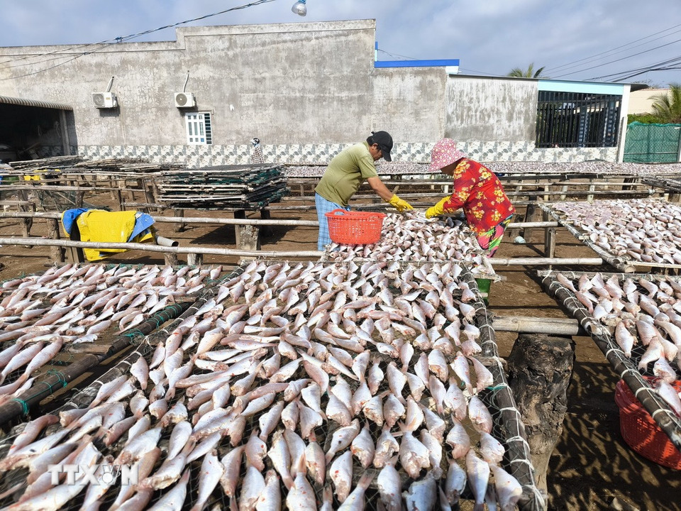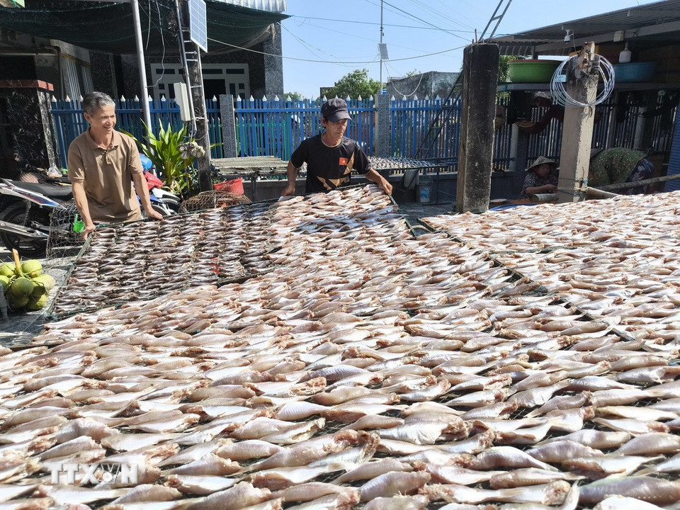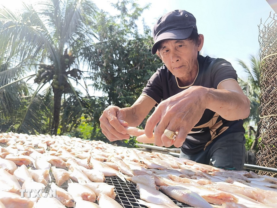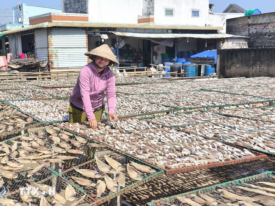 Làng nghề cá khô Bình Thắng (xã Bình Đại, tỉnh Vĩnh Long). (Ảnh: Huỳnh Phúc Hậu/TTXVN)