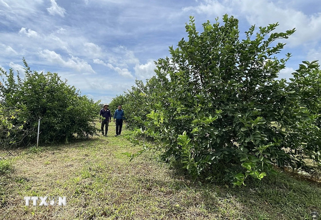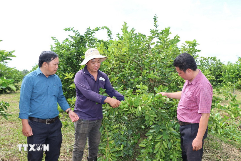 Vườn chanh không hạt 1,3ha của gia đình ông Lâm Văn Quốc (giữa) tại xã Tân An, Vĩnh Long. (Ảnh: Thanh Hòa/TTXVN)