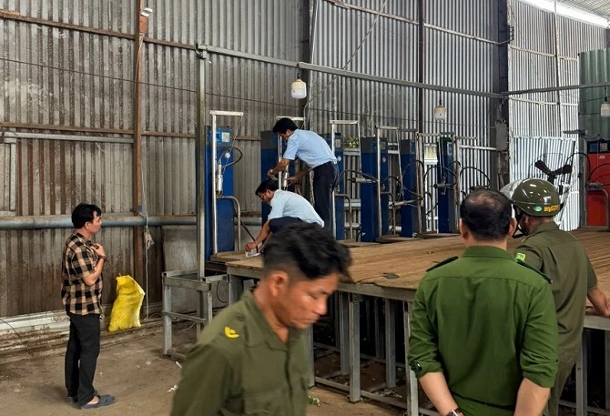 Qua kiểm tra, lực lượng chức năng phát hiện trạm nạp LPG của Công ty Lâm Thái Huy có 2 bồn chứa LPG nhưng không ghi thông tin, không xác định được số lượng và thể tích. Trạm có 10 trụ nạp LPG vào chai, gồm 6 trụ màu xanh ghi WEIGHING CONTROLLER, CAS-SY.5532, MAX=150kg, d=50g và 4 trụ màu cam ghi WEIGHING CONTROLLER, MAX=150kg, d=50g. Tại hiện trường còn có 2 chai LPG mang nhãn SOPET Gas One loại 12kg, 1 chai ghi SP SAIGON PETRO và 1 chai ghi SP, SAIGON PETRO.
