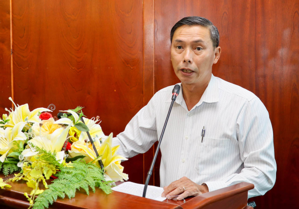 Ông Nguyễn Văn Giới, Phó Giám đốc Sở Khoa học và Công nghệ tỉnh Vĩnh Long phát biểu tại Lễ ra mắt Nền tảng Cơ sở dữ liệu nền tỉnh Vĩnh Long (GIS).