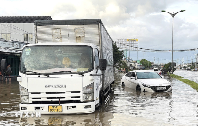 Đoạn quốc lộ 1 qua phường Bình Minh bị ngập sâu, ảnh hưởng đến việc lưu thông. (Ảnh: Lê Thúy Hằng/TTXVN)