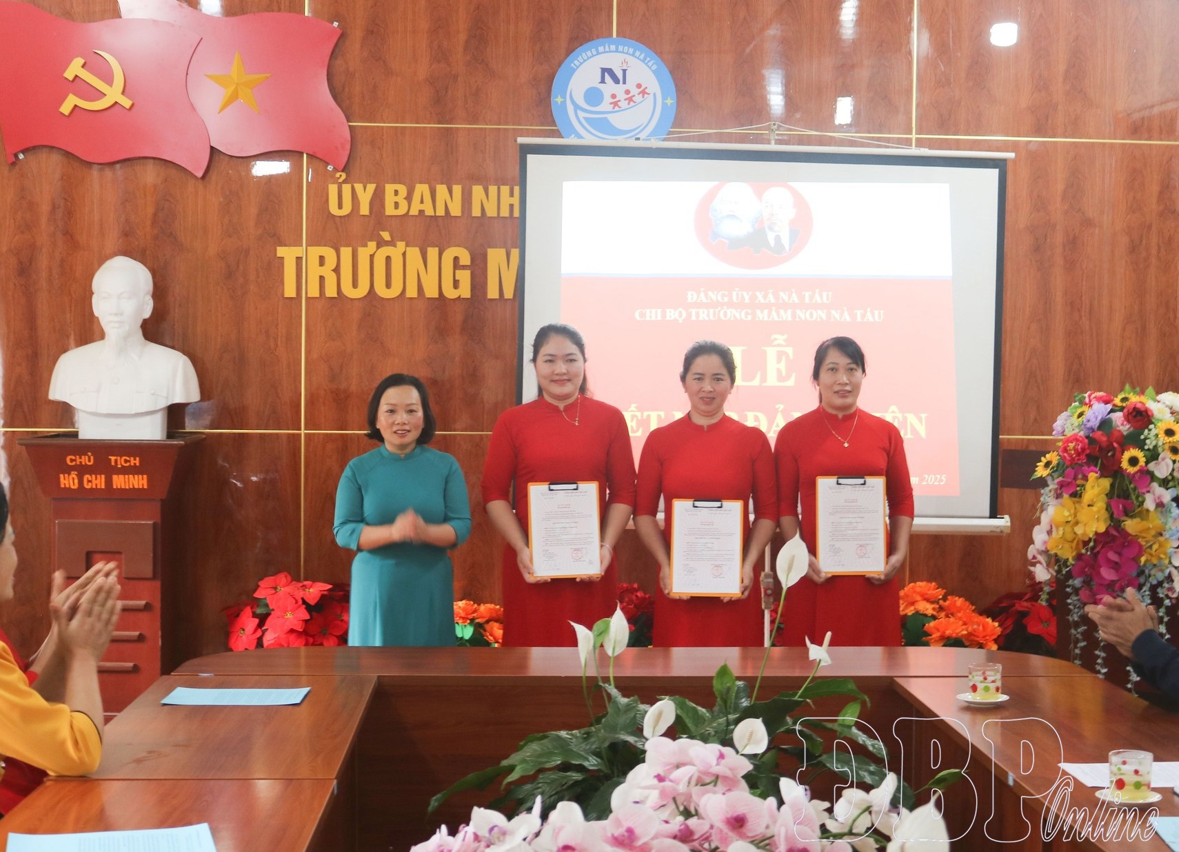Ba quần chúng ưu tú Nguyễn Thanh Tâm, Tòng Thị Tươi và Hoàng Thị Thanh Hải (Trường Mầm non Nà Tấu) vinh dự nhận Quyết định kết nạp đảng viên.
