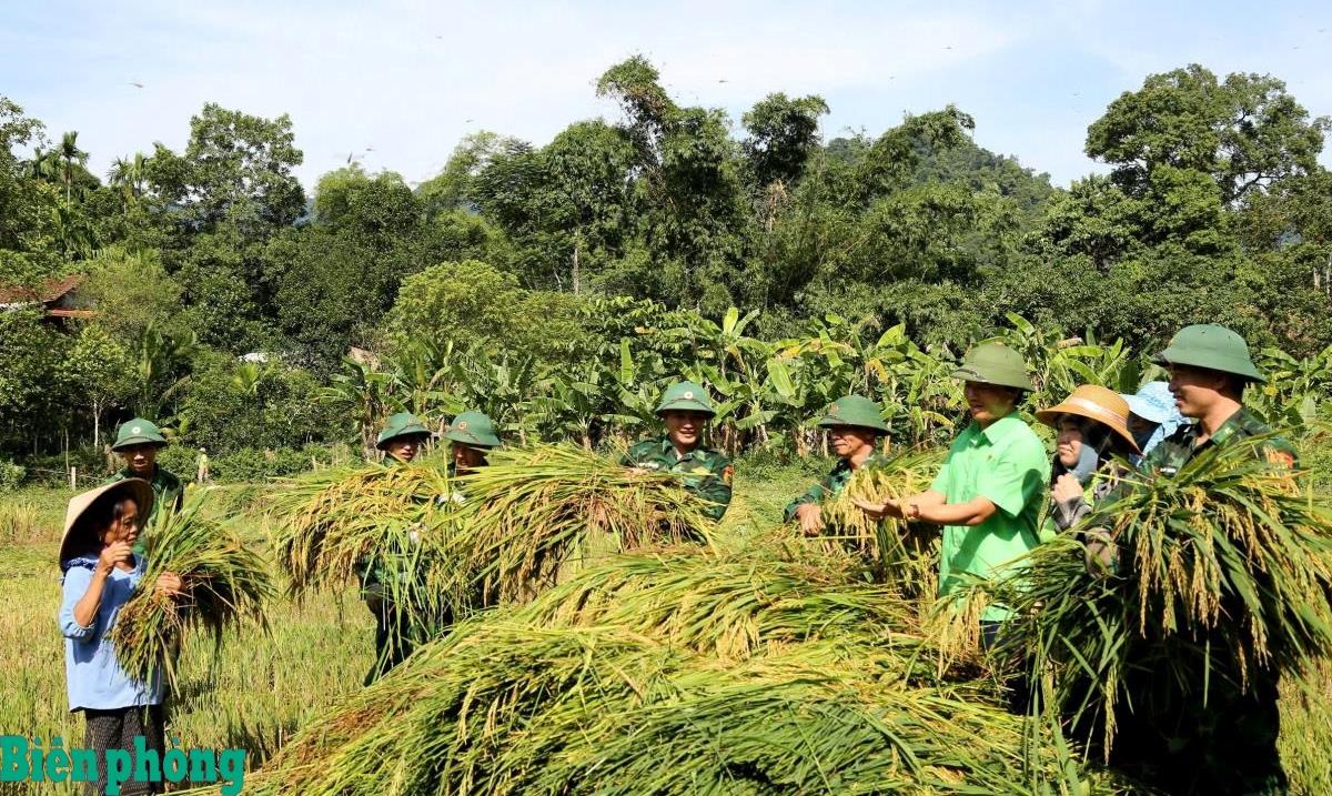 Cán bộ, chiến sĩ Đồn Biên phòng Bàn Giàng, Bộ đội Biên phòng tỉnh Hà Tĩnh giúp bà con dân tộc Chứt trên địa bàn thu hoạch lúa. Ảnh: Minh Toàn