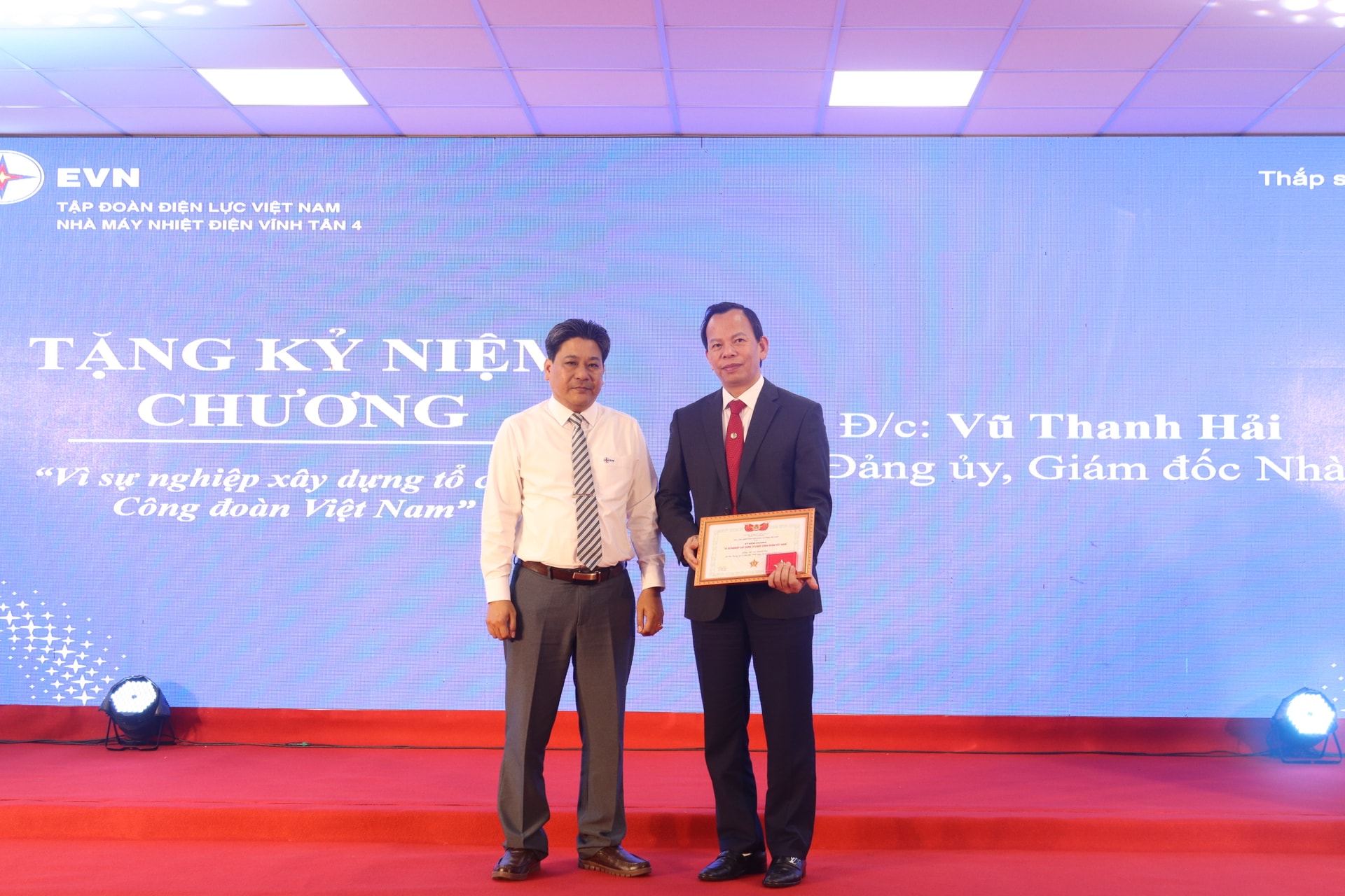 Ông Vũ Thanh Hải, Bí thư Đảng ủy, Giám đốc NM Nhiệt điện Vĩnh Tân 4 (bên phải) nhận Kỷ niệm chương của Ban Chấp hành Tổng Liên đoàn Lao động Việt Nam