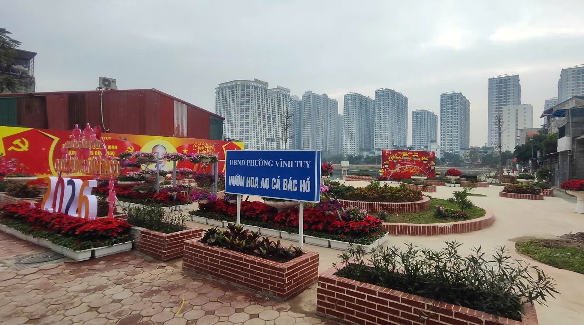 Khu vực Ao cá Bác Hồ được phường Vĩnh Tuy đầu tư xây dựng đường dạo quanh hồ, vườn hoa cây xanh, hệ thống rãnh thu gom nước thải sinh hoạt. Ảnh: CTV