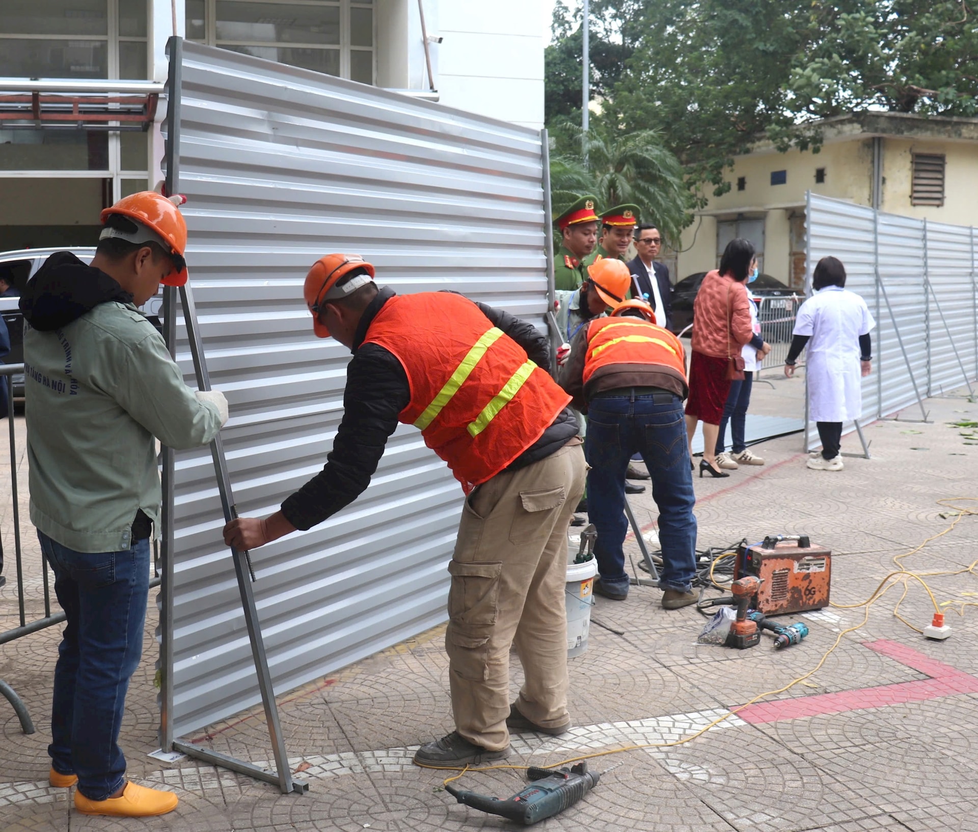 UBND phường Vĩnh Tuy lắp dựng hàng rào tôn trong phạm vi dự án. Ảnh: T. Linh