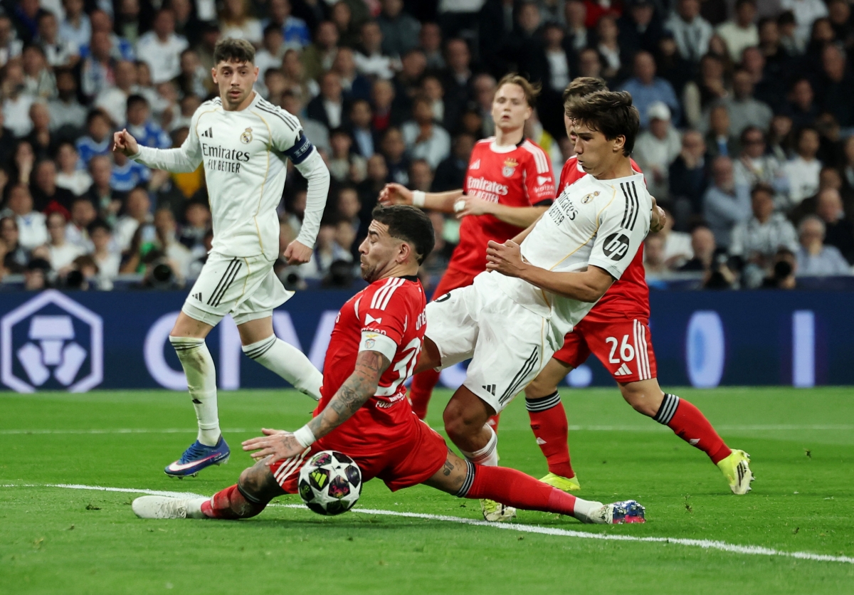 Dù được chơi trên sân nhà và có lợi thế từ trận lượt đi, Real Madrid nhập cuộc không thực sự áp đảo. Benfica chủ động đẩy cao đội hình và tạo ra sức ép đáng kể. Phút 14, Vangelis Pavlidis tận dụng tình huống lộn xộn trong vòng cấm để ghi bàn mở tỷ số cho đội khách, khiến khán đài Bernabéu lặng đi trong giây lát.