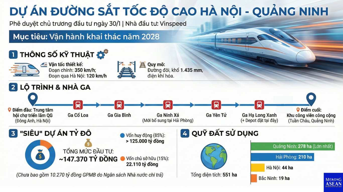 Ngày 30/1, UBND tỉnh Quảng Ninh có quyết định phê duyệt chủ trương đầu tư dự án đường sắt tốc độ cao Hà Nội - Quảng Ninh, đồng thời chấp thuận nhà đầu tư là CTCP đầu tư và phát triển đường cao tốc Vinspeed. Tỉnh xác định tiến độ đưa công trình vào khai thác, vận hành trong năm 2028.