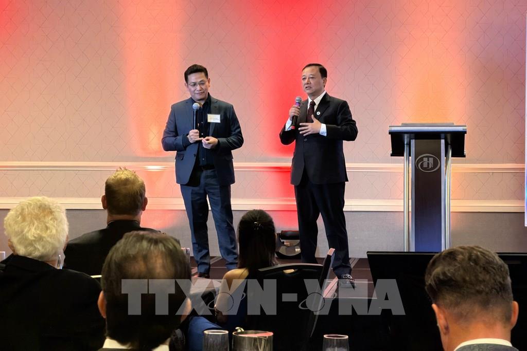 Chủ tịch Hội đồng quản trị kiêm Tổng Giám đốc VIPTAM Group Nguyễn Thanh Tuấn (bên phải) giới thiệu về mô hình hợp tác với Inlog. Ảnh: Ngọc Quang, PV TTXVN tại Mỹ