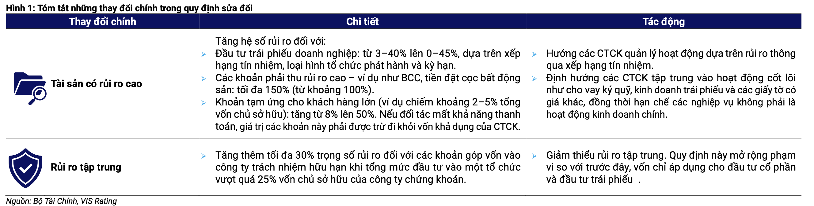 Nhóm phân tích kỳ vọng, quy định sửa đổi sẽ định hướng các CTCK tập trung vào hoạt động cốt lõi như cho vay ký quỹ, kinh doanh trái phiếu và các giấy tờ có giá khác, đồng thời hạn chế các nghiệp vụ không phải là hoạt động kinh doanh chính như phải thu BCC. Phân tích của VIS Rating cho thấy một số CTCK có lượng lớn phải thu BCC, thường gắn với cho vay các doanh nghiệp có dòng tiền yếu, đòn bẩy cao và lịch sử chậm trả trái phiếu, gây rủi ro tổn thất tín dụng cao.