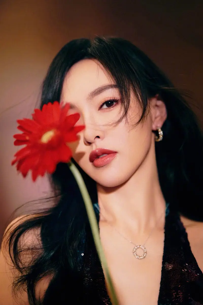 Đường Yên toát lên vẻ đẹp kiêu sa và đầy chất thơ, tựa như một đóa hoa rực rỡ đang nở rộ giữa bầu không khí tiệc tùng cuối năm. Nữ diễn viên xuất hiện đầy cuốn hút với mái tóc đen buông xõa tự nhiên, tôn lên làn da trắng sứ và gương mặt thanh tú dưới ánh sáng vàng ấm áp. Điểm nhấn nằm ở bông hoa đồng tiền đỏ thắm che hờ một bên mắt, không chỉ tạo nên sự bí ẩn, chiều sâu cho khuôn mặt mà còn mang ngụ ý về sự may mắn, tài lộc trong năm mới.Sự kết hợp giữa chiếc váy đính sequin lấp lánh cùng bộ trang sức kim cương tinh tế giúp Đường Yên hoàn thiện diện mạo của một "nữ thần" phương Đông: vừa mang nét cổ điển, dịu dàng, vừa hiện đại và tràn đầy sức sống. Tổng thể bức hình là một thông điệp về sự viên mãn và nhan sắc rạng ngời, sẵn sàng đón nhận những điều tốt đẹp nhất trong khởi đầu mới.