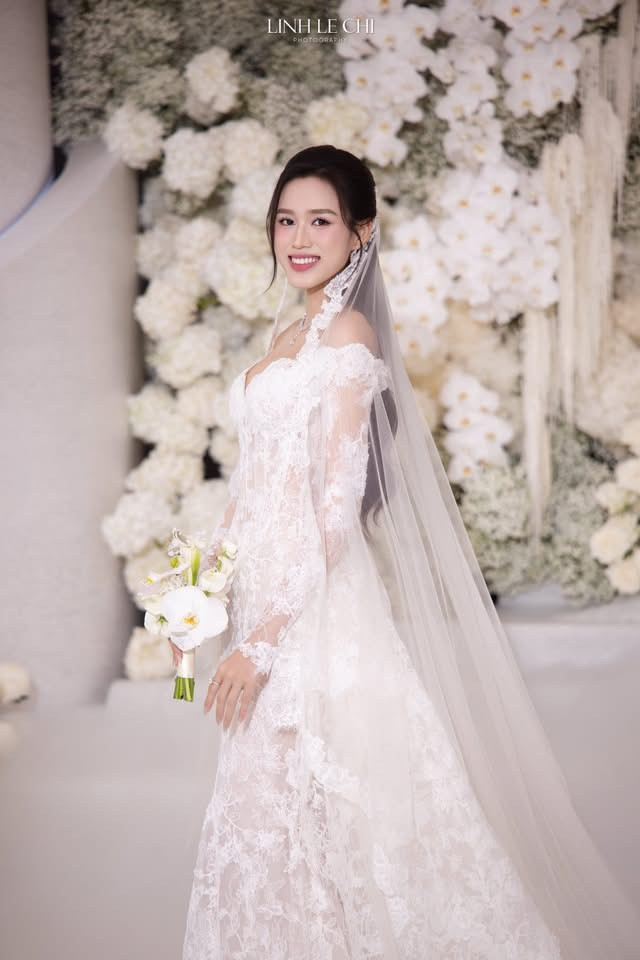 Hoa hậu Đỗ Thị Hà diện váy cưới voan trắng tại tiệc cưới tối nay. Ảnh: Linh Le Chi Photography