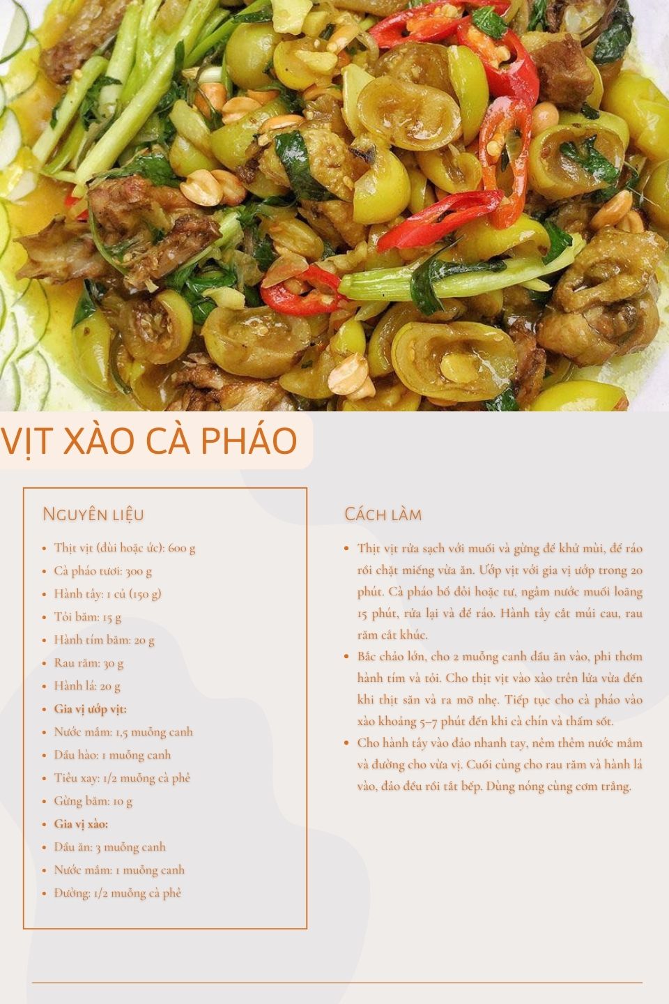 Cà pháo là nguyên liệu tạo điểm nhấn cho món ăn. Khác với cà pháo muối quen thuộc, cà pháo dùng để xào thường chia đôi hoặc chia làm tư, ngâm nước muối loãng để giảm vị hăng. Khi xào chín tới, cà pháo giữ độ giòn nhẹ, thấm sốt và mang vị bùi bùi đặc trưng. Chính sự giòn giòn của cà pháo đã tạo nên sự tương phản thú vị với phần thịt vịt mềm, giúp món ăn không bị đơn điệu.