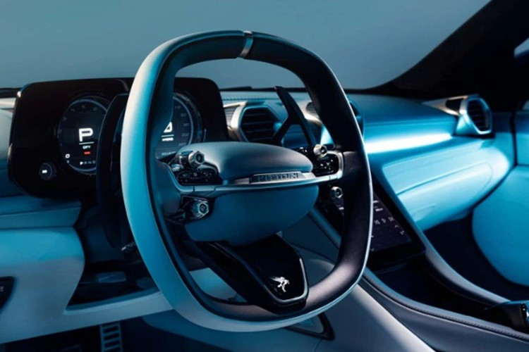 Khoang lái được thiết kế ấn tượng không kém ngoại thất, với vô-lăng tích hợp nhiều nút điều khiển, màn hình trung tâm đặt dọc, cụm đồng hồ kỹ thuật số bán phần, đèn nội thất ambient, và tông màu da trắng - đen - xanh tương phản.