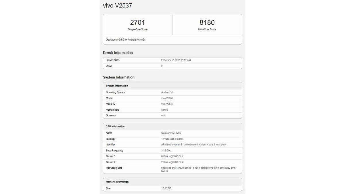 Trong bài kiểm tra Geekbench 6.5, vivo X300 FE đạt 2,701 điểm trong thử nghiệm đơn nhân và 8,180 điểm trong thử nghiệm đa nhân. Máy sở hữu RAM 12GB và chạy trên hệ điều hành Android 16 với giao diện OriginOS 6 ngay từ khi xuất xưởng.