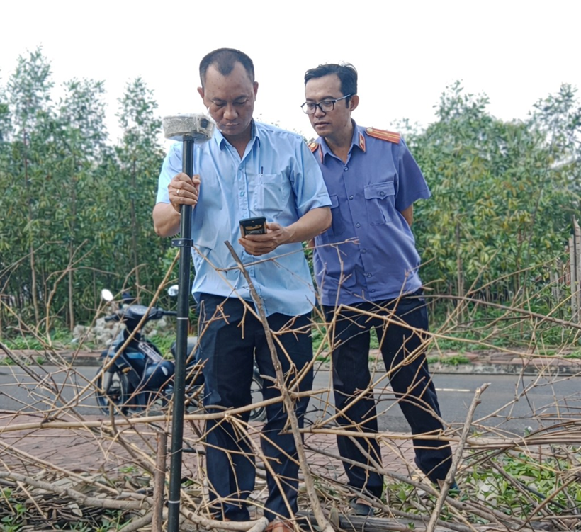 Kiểm sát viên kiểm sát việc cắm mốc thực địa của diện tích đất bị cưỡng chế.