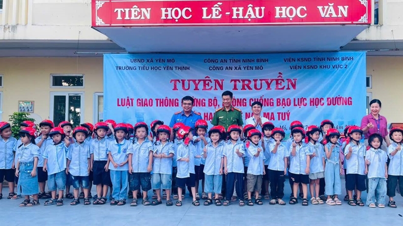 Lãnh đạo VKSND khu vực 2 và Lãnh đạo Công an xã Yên Mô, Ban Giám hiệu Nhà trường trao tặng mũ bảo hiểm cho các cháu học sinh trường tiểu học Yên Thịnh.