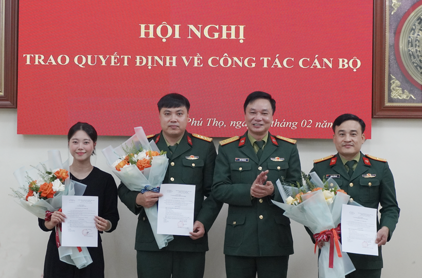 Đại tá Văn Thanh Hòa, Bí thư Đảng ủy, Viện trưởng VKSQS Quân khu 2 trực tiếp trao quyết định cho các đồng chí Thiếu tá QNCN Trịnh Tiến Hòa, VKSQS Quân khu điều động về VKSQS khu vực 21; Đại úy QNCN Đào Văn Lợi và cán bộ tạm tuyển Nguyễn Thu Phương- VKSQS khu vực 21 về công tác tại VKSQS Quân khu.