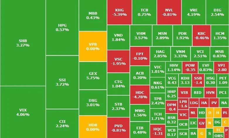 Các mã SSI (+3,72%), SHS (+3,74%), SHB (+3,27%), STB (+2,37%), TPB (+2,42%), VIX (+4,06%) đồng loạt tăng mạnh, đóng góp đáng kể vào đà đi lên của chỉ số.