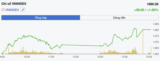 Bước sang buổi chiều, sắc xanh lan rộng trên toàn thị trường. Mặc dù buổi sáng chỉ tăng nhẹ hơn 6 điểm, VN-Index đã bứt tốc mạnh mẽ về cuối phiên. Chốt ngày 26/11, VN-Index tăng tròn 20 điểm lên 1.680,36 điểm, tiến gần vùng 1.700 điểm. HNX-Index cũng đảo chiều tăng 4,61 điểm lên 261,91 điểm, còn UPCoM nhích 0,3 điểm lên 119,22 điểm.