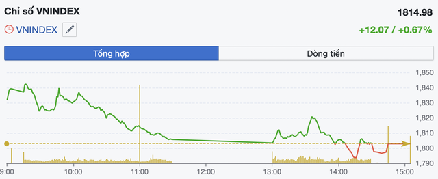Kết thúc phiên, VN-Index tăng 12,07 điểm, tương đương 0,67%, lên 1.814,98 điểm. Trên sàn Hà Nội, HNX-Index nhích nhẹ 0,25 điểm lên 252,72 điểm, trong khi UPCoM-Index tăng 0,73 điểm lên 128,42 điểm.