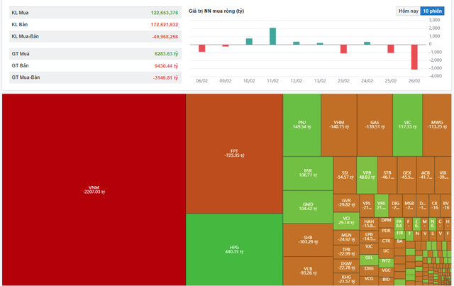 Tại phiên giao dịch 26/2, tâm điểm của nhà đầu tư tập trung vào hành động của khối ngoại. Các nhà đầu tư nước ngoài bán ròng cực mạnh với hơn 3.146 tỷ đồng trên sàn HSX. Trong đó, trọng tâm xả hàng tại cổ phiếu VNM của Vinamilk với -2.207 tỷ đồng. Tiếp theo là cổ phiếu FPT -725,35 tỷ đồng, GAS -139,51 tỷ đồng, SHB 103,29 tỷ đồng...
