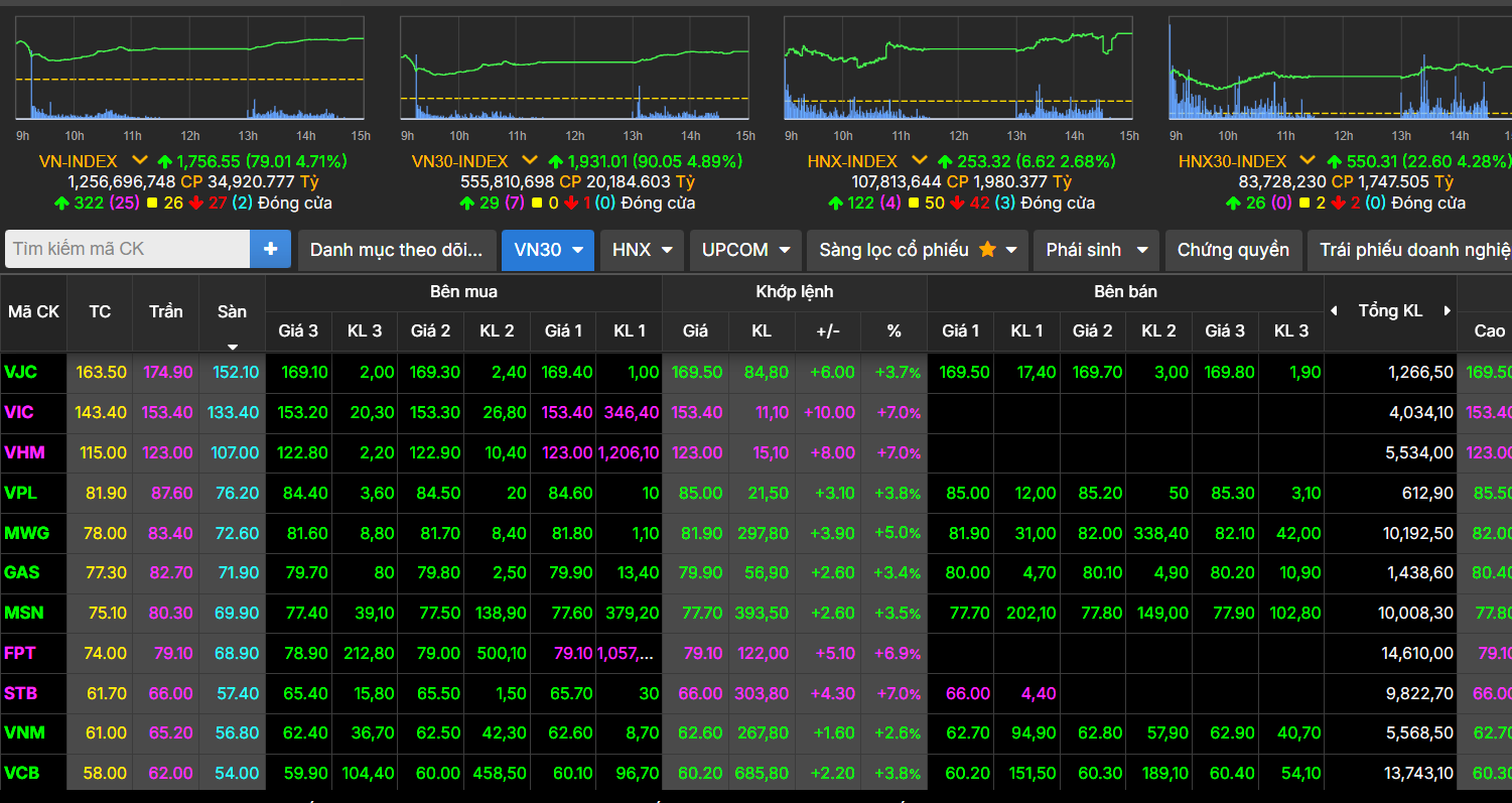 Sang phiên chiều, lực cầu gia tăng giúp thị trường càng về cuối phiên càng bứt phá. Đóng cửa, VN-Index tăng 79,01 điểm (4,71%), lên 1.756,55 điểm; VN30-Index đạt 1.931,01 điểm, tăng 90,05 điểm (4,89%).