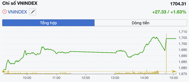 Sang phiên chiều, đà tăng của thị trường được nối dài và thậm chí bứt phá mạnh hơn. VN-Index nhanh chóng vượt mốc 1.700 điểm, giữ vững xu hướng tích cực và chốt phiên tại 1.704,31 điểm, tăng 27,33 điểm, tương ứng 1,63% so với tham chiếu.