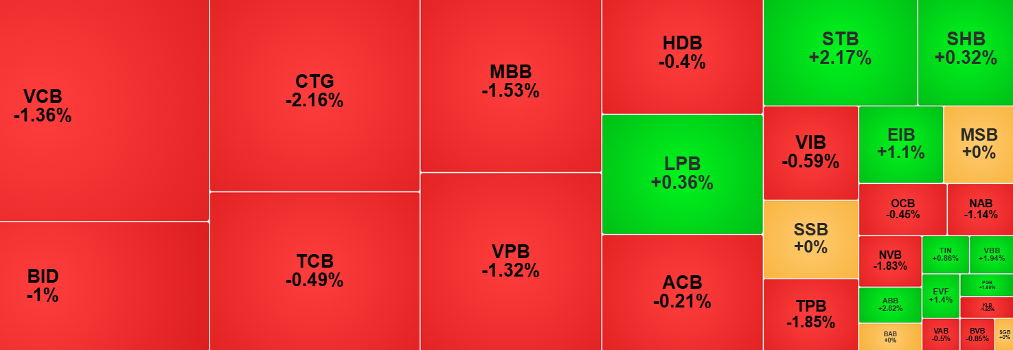 Nhóm cổ phiếu ngân hàng tác động đáng kể đến sự đi xuống của thị trường phiên ngày 30-3. Ảnh chụp qua màn hình.