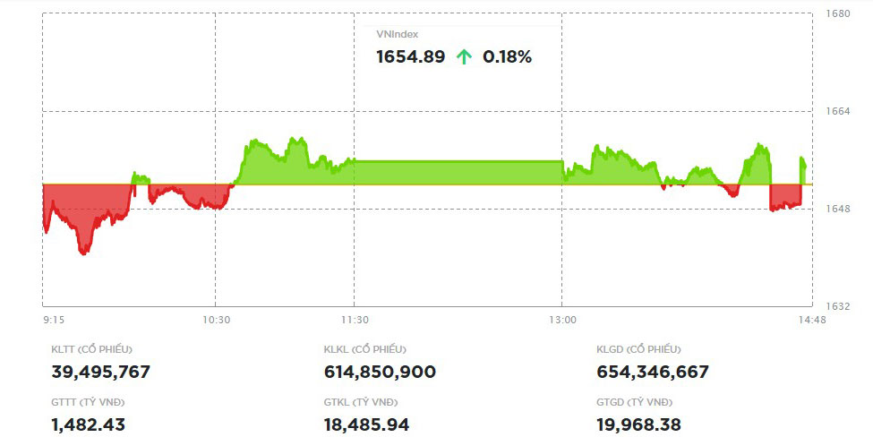 Chốt phiên hôm nay, VN-Index tăng 2,91 điểm (+0,18%) lên 1.654,89 điểm với 121 mã tăng, trong khi có 190 mã giảm. Tổng khối lượng giao dịch đạt 654,3 triệu đơn vị, giá trị 19.968,4 tỷ đồng, giảm 45,4% về khối lượng và 41,7% về giá trị so với phiên hôm qua. Trong đó, giao dịch thỏa thuận đóng góp 39,5 triệu đơn vị, giá trị 1.482,4 tỷ đồng.