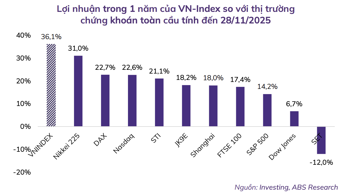 Tính đến cuối tháng 11, so với biến động của một số chỉ số chứng khoán trên thị trường thế giới, VN-Index có hiệu suất tốt nhất khi tăng +36,1% trong 12 tháng, xếp sau là Nikkei 225 với mức tăng +31%.
